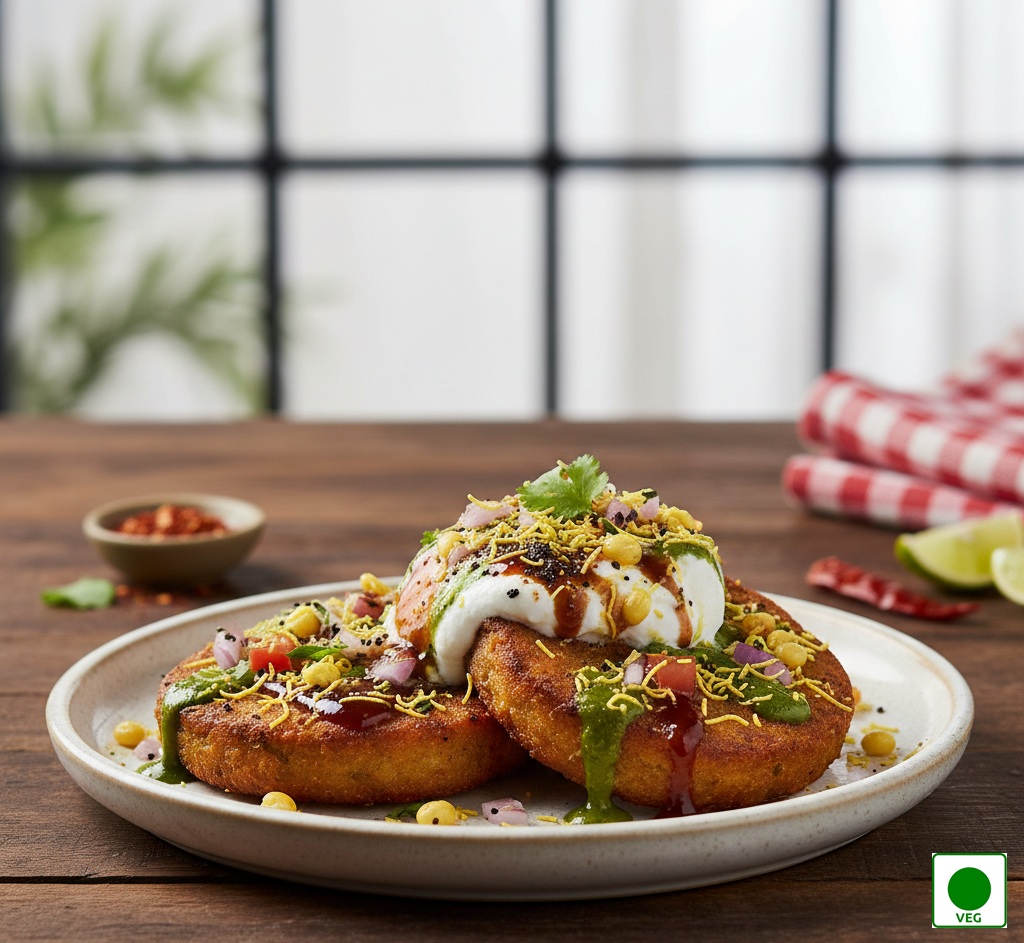 Golden fried aloo tikki topped with chutneys, curd, onions, tomato, and inhouse masala and sev, masala chana dal, boondies — crispy, spicy, and indulgent.