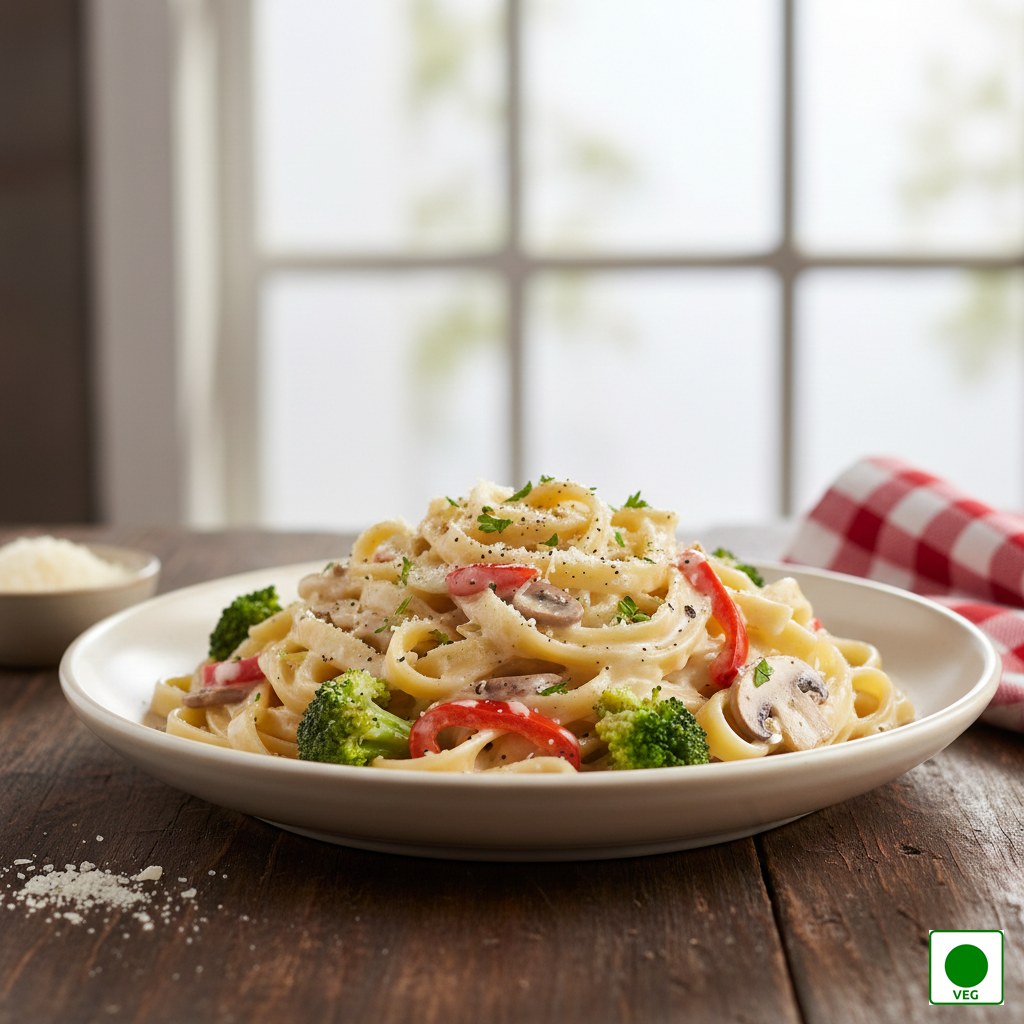 Creamy white sauce pasta made with rich butter, garlic, herbs, and fresh vegetables — smooth, comforting, and indulgently creamy.