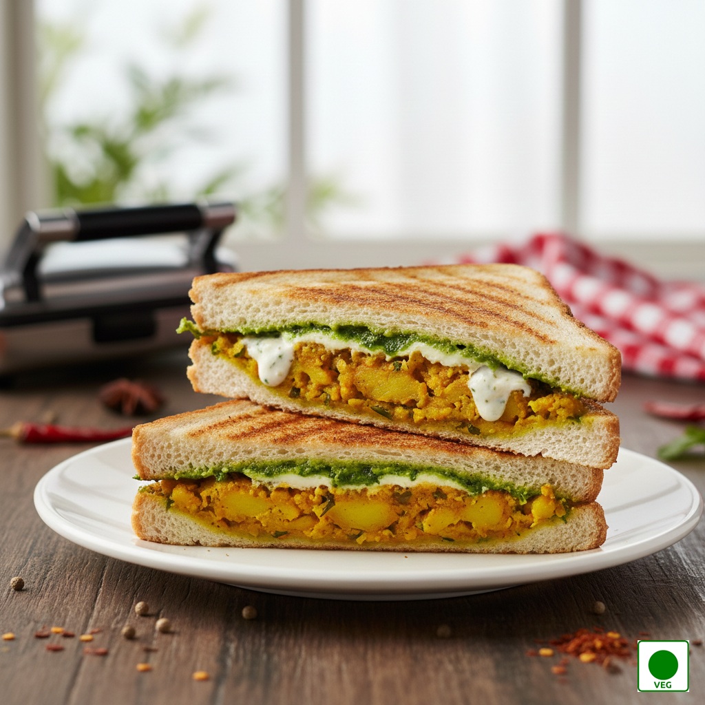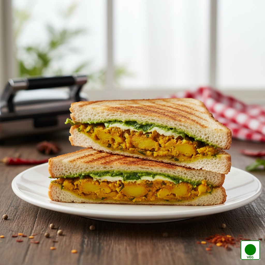 Spiced potato masala layered with calcium, chutneys, and buttered grilled bread — crispy outside, soft and flavourful inside.