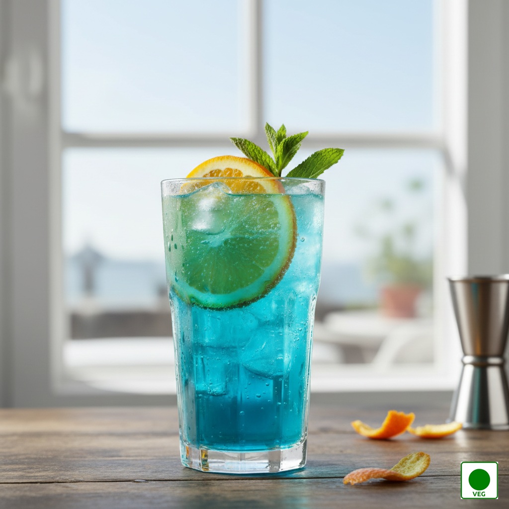 A vibrant blue mocktail with citrus flavours and soda — tangy, fizzy, and visually refreshing.