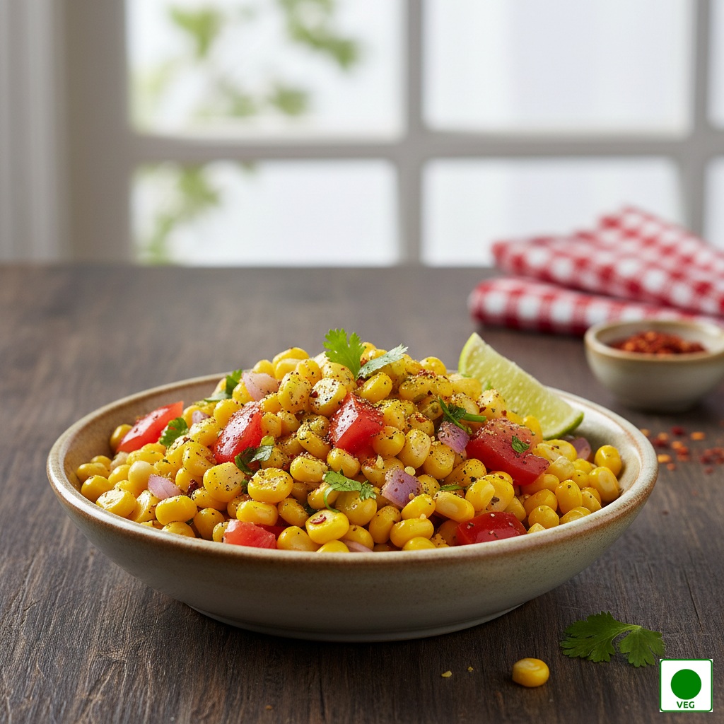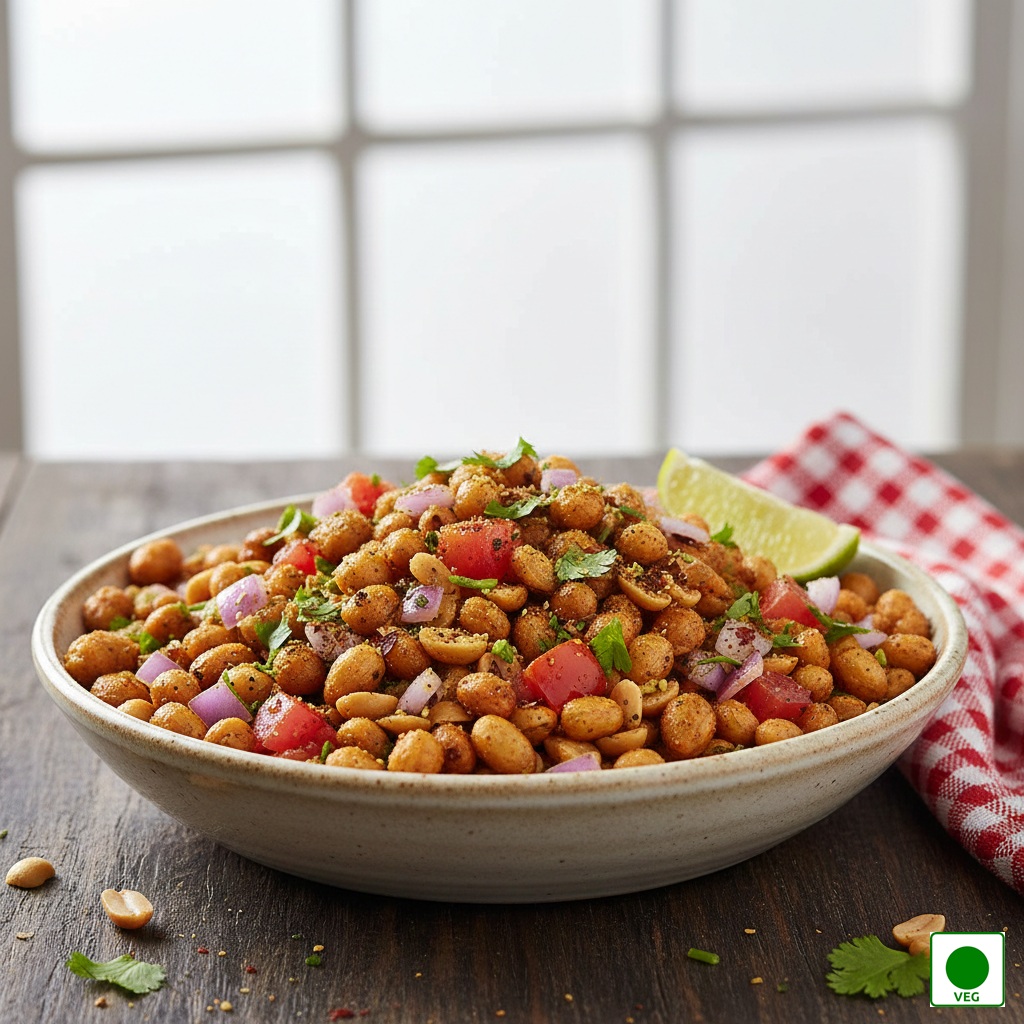 Fried peanuts tossed with onions, tomatoes, lemon, chaat masala, and fresh coriander — crunchy, tangy, and refreshing.