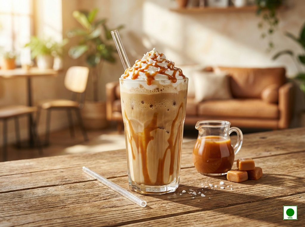 Chilled coffee blended with creamy milk and rich caramel — smooth, sweet, and irresistibly indulgent.