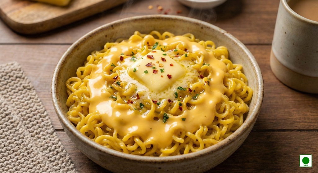 Buttery Maggie topped with liquid cheese — creamy, cheesy, and indulgent.