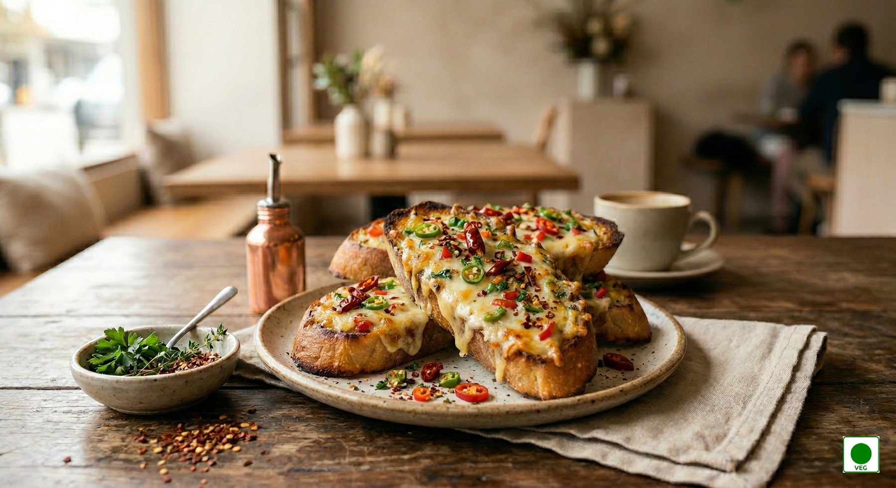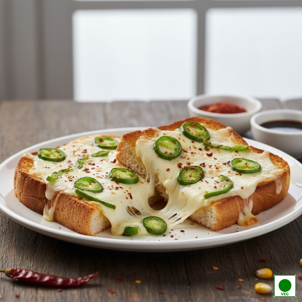 Melted cheese layered with spicy green chillies on crisp toasted bread — bold, hot, and irresistibly cheesy.