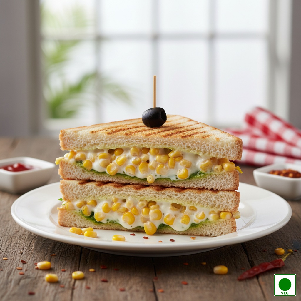 A triple-layered sweet corn and melted cheese layered with sauces in grilled bread — creamy, sweet, and comforting.