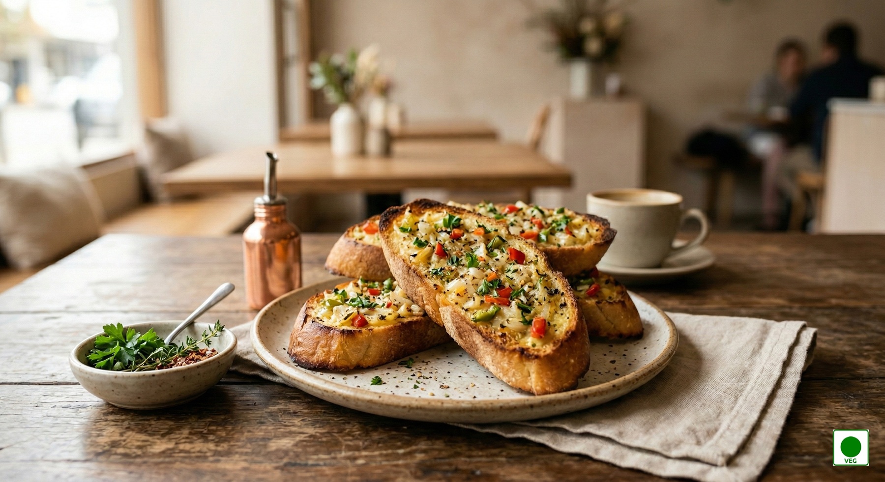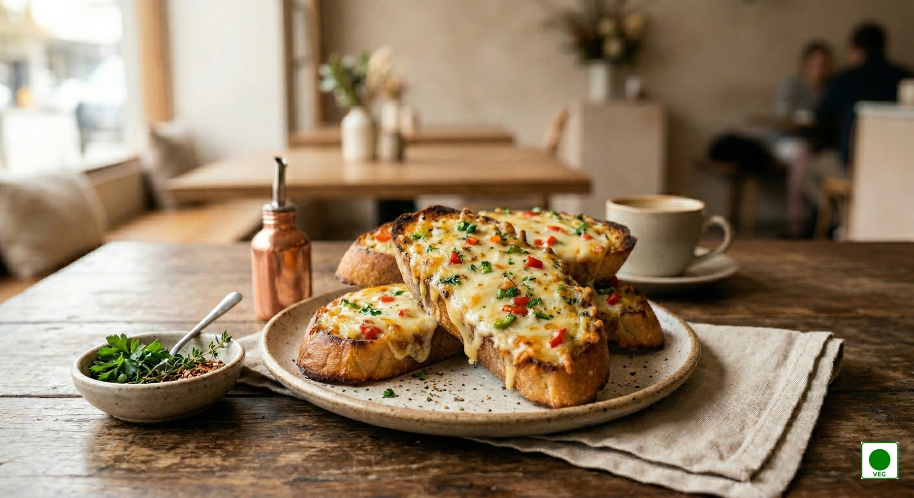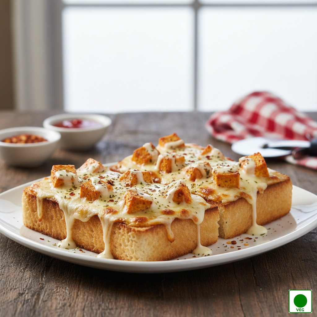 Garlic bread infused with garlic butter, Onion, capsicum, herbs, and mild spices — rich, and flavourful.
