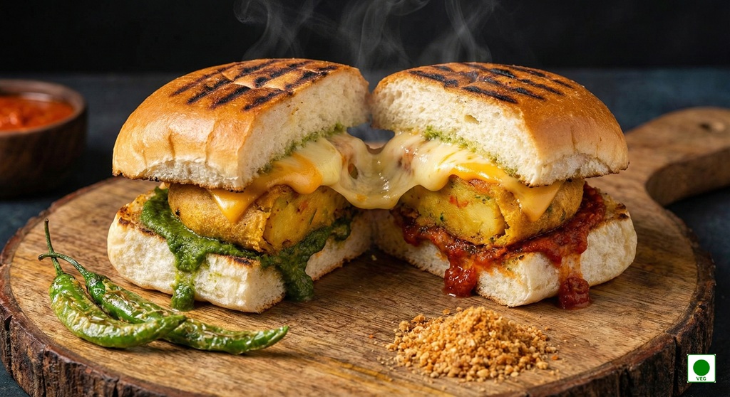 Grilled pav stuffed with spicy vada and melted cheese — rich, crispy, and indulgent.