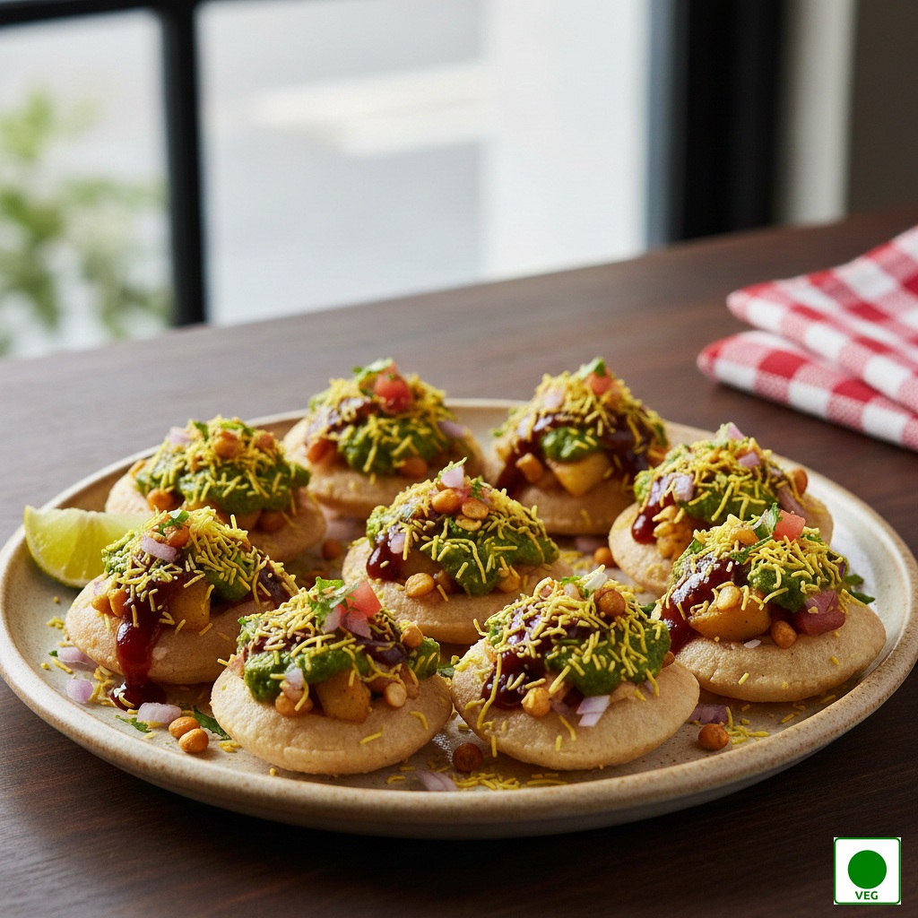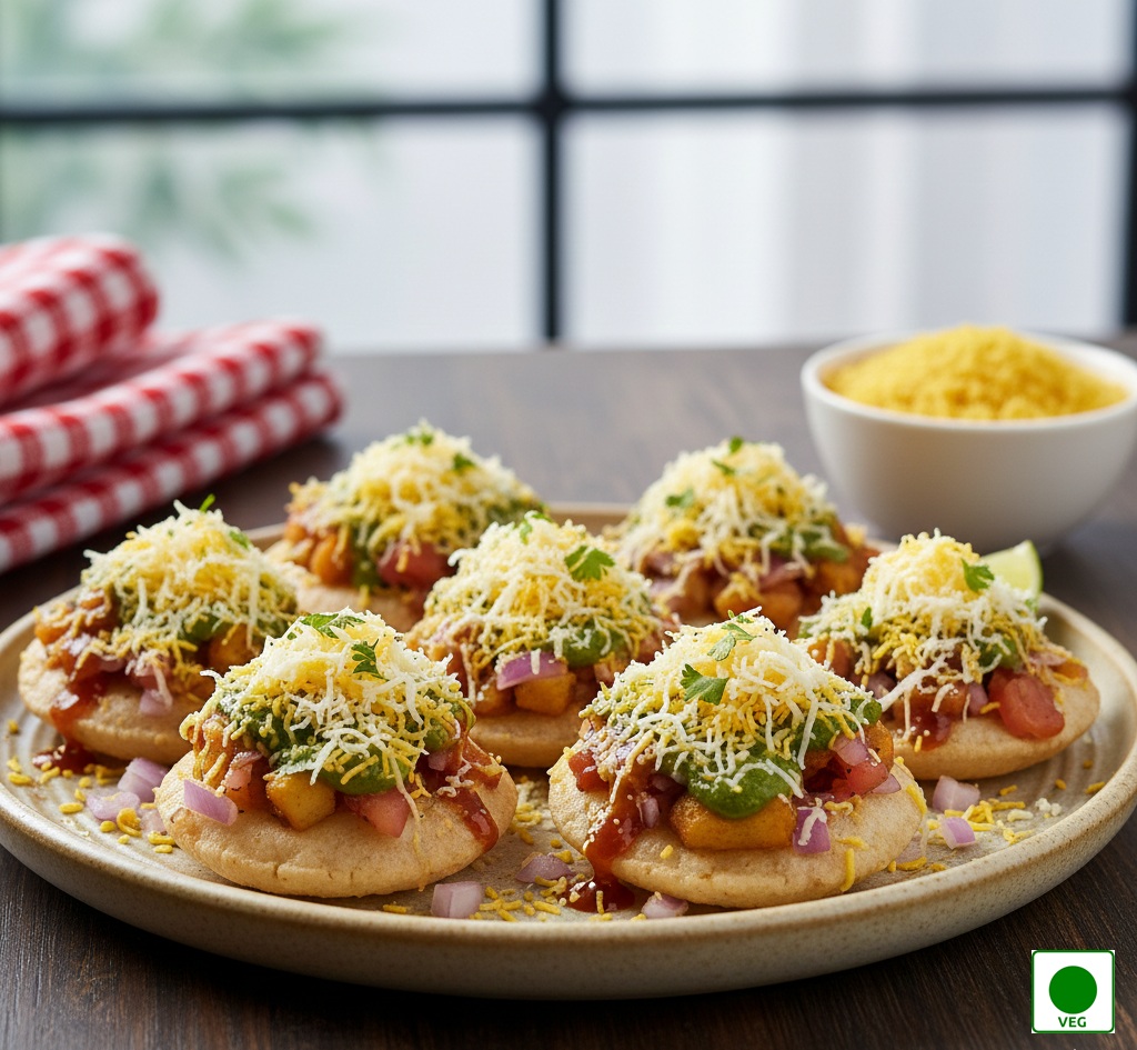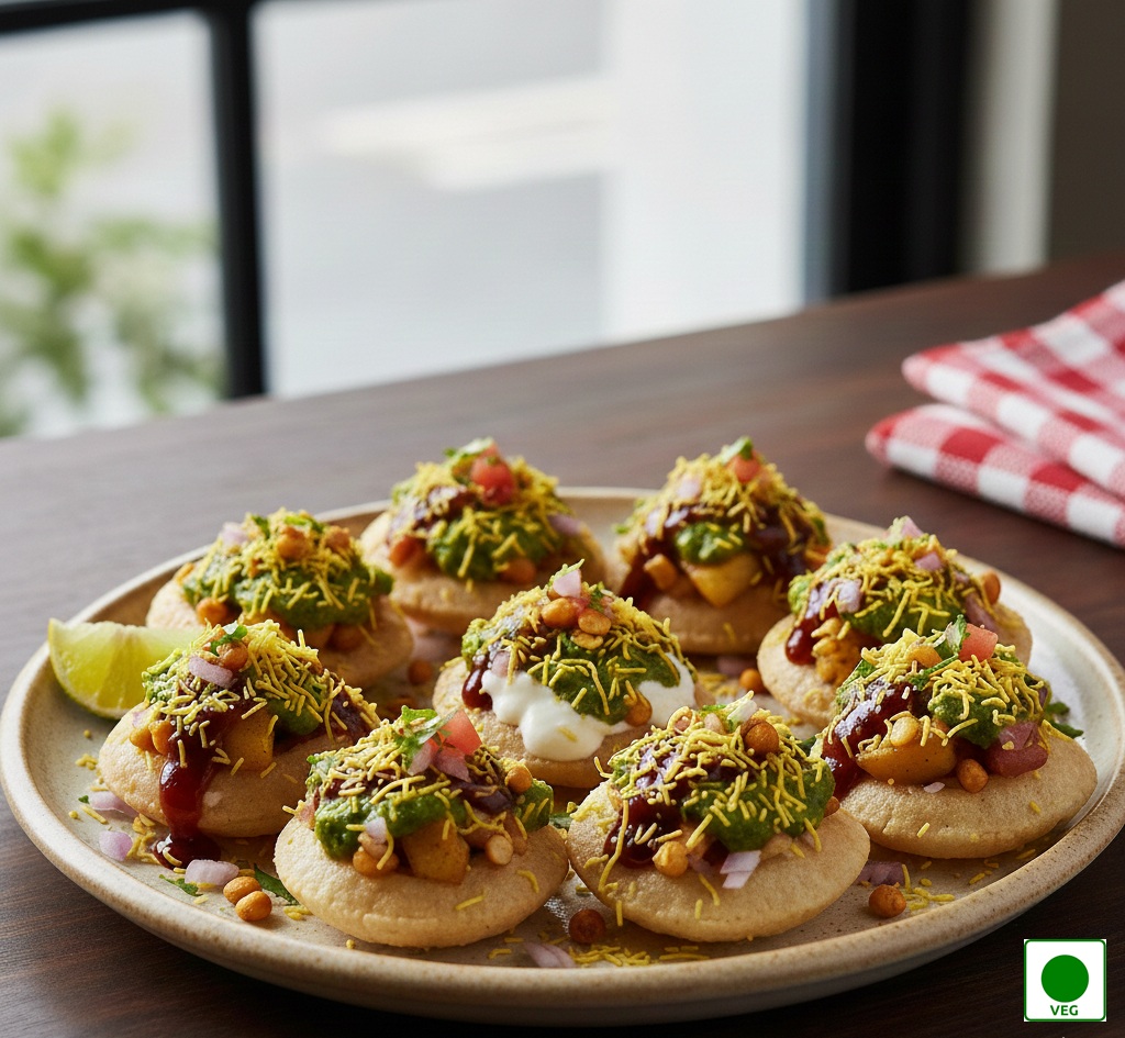 Crispy puris topped with boiled potatoes, chutneys, onions, tomato, fresh curd and sev, masala chana dal, bundies — creamy, tangy, and perfectly balanced.
