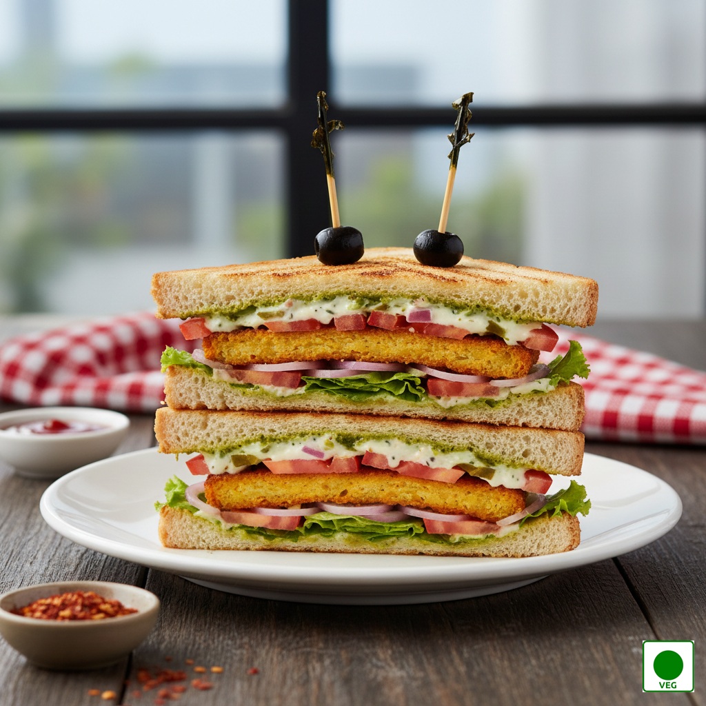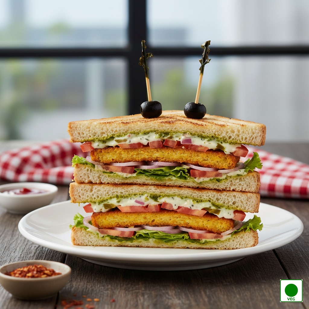 A triple-layered sandwich with veg petty, fresh vegetables, creamy sauces, and grilled bread — filling, classic, and delicious.