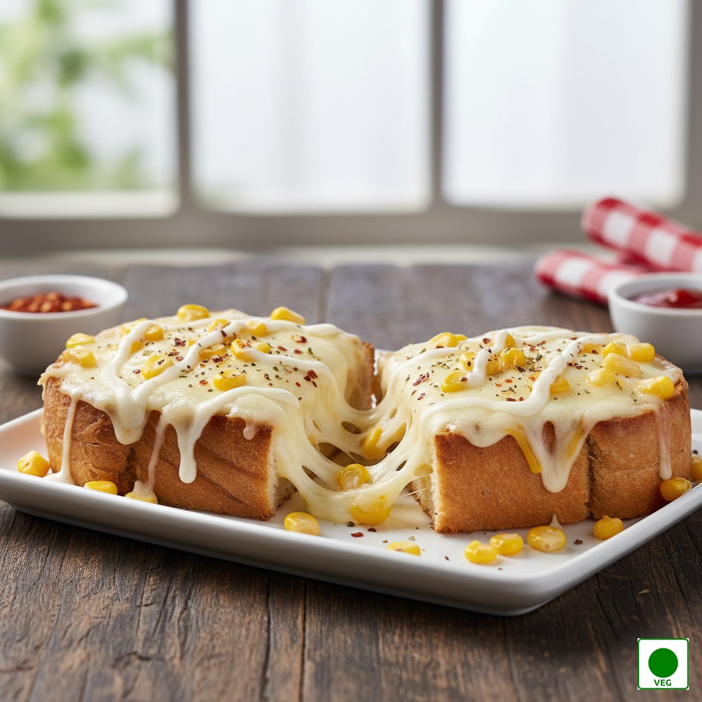 Sweet corn blended with melted cheese and creamy sauces on crisp toast — smooth, comforting, and delicious.