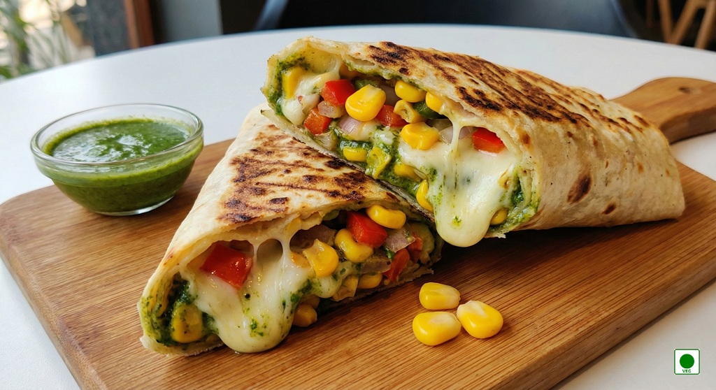 Sweet golden corn blended with creamy melted cheese, fresh veggies, and zesty green chutney, grilled to golden perfection in a warm wrap.