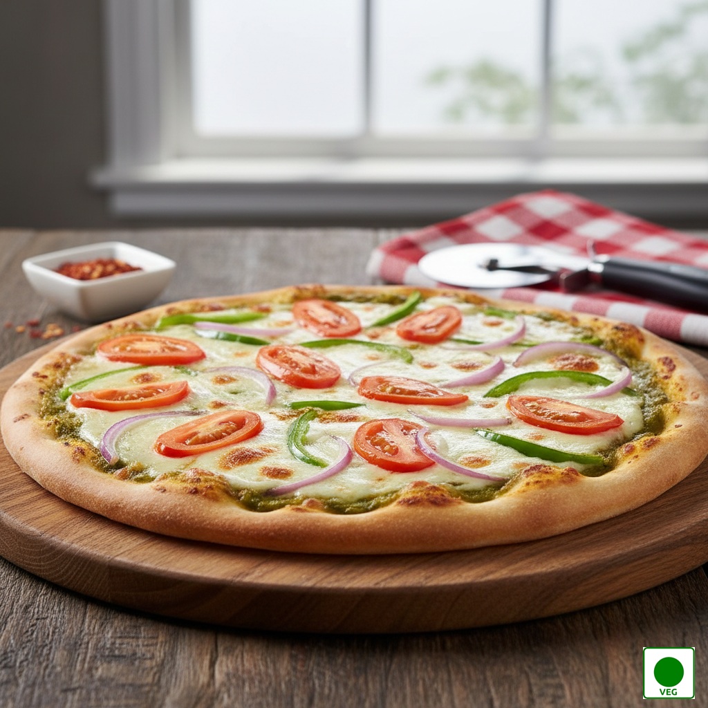 A flavorful green chutney base topped with fresh onions, juicy tomatoes, and crisp capsicum, finished with melted mozzarella on a golden, oven-baked crust.