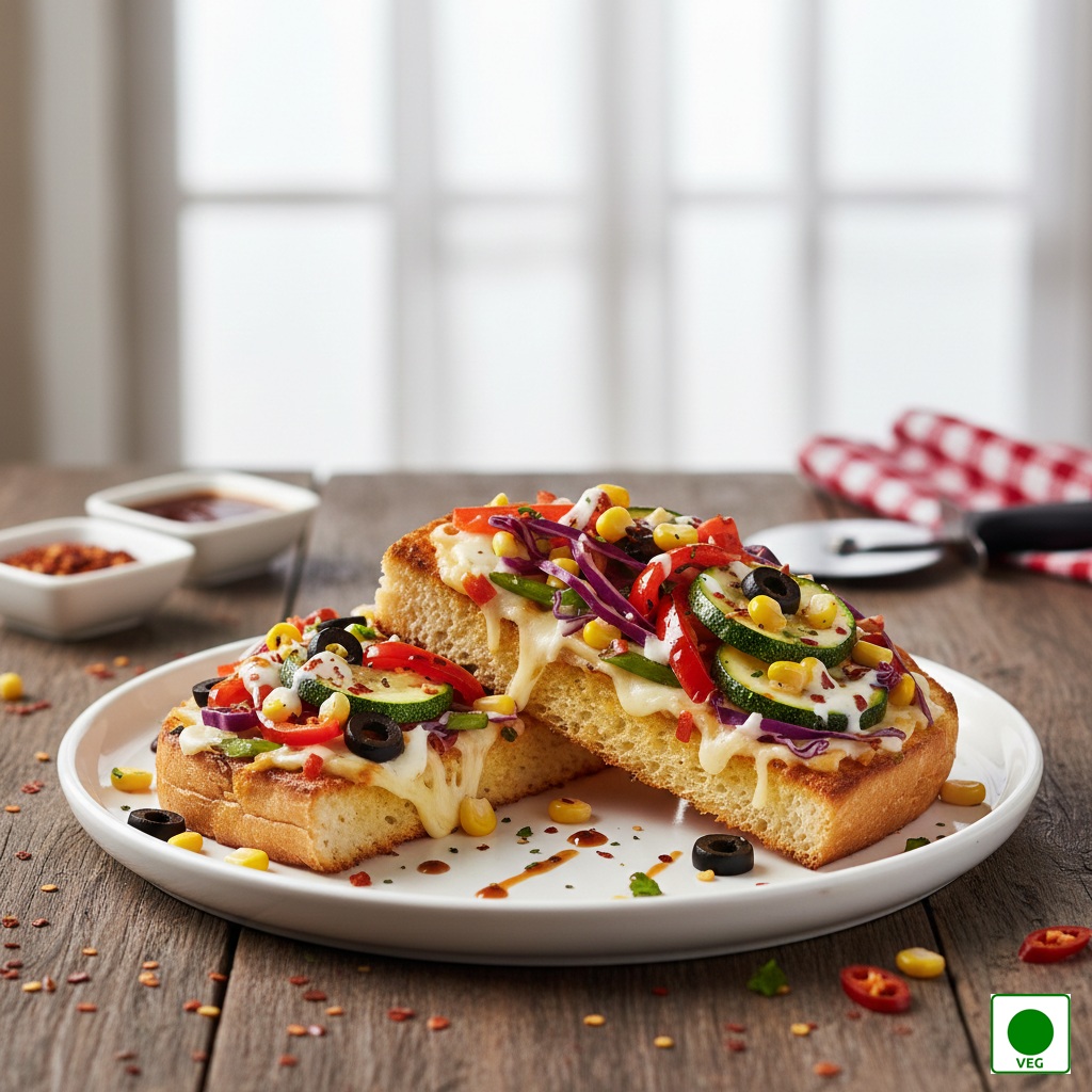 Spiced aloo masala topped with melted cheese, capsicum, and sauces in buttered grilled bread — creamy, spicy, and satisfying.