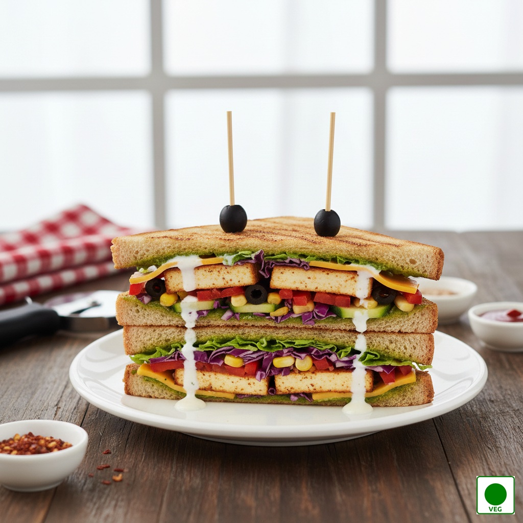 A triple-layered marinated paneer layered with fresh veggies, chutneys, and sauces in toasted bread — rich, soft, and flavourful.