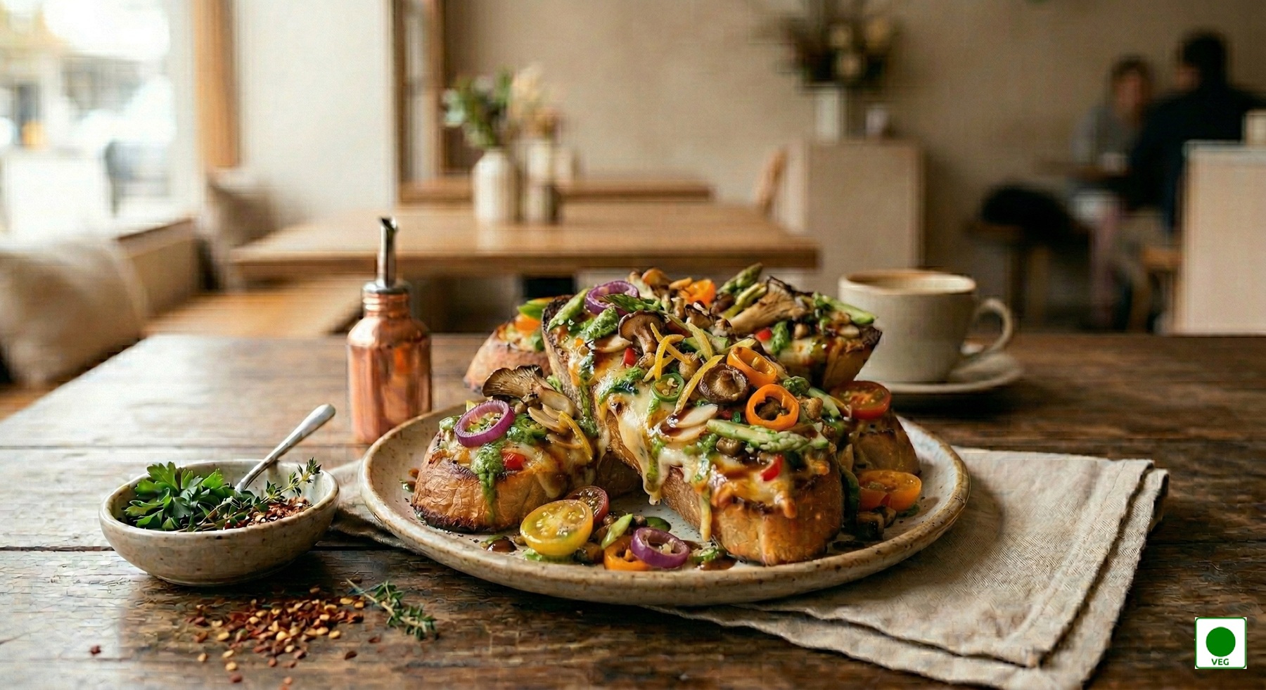 A colourful mix of exotic vegetables layered with cheese and special sauces on crisp toast — rich, fresh, and indulgent.