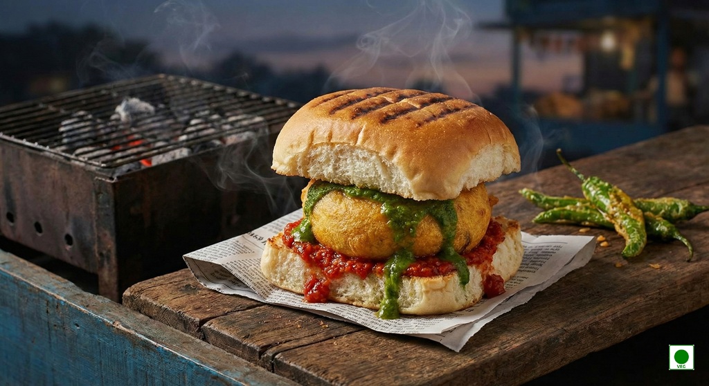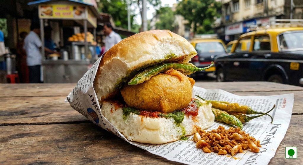 Mumbai’s iconic spicy potato vada in a soft pav — simple, spicy, and satisfying.