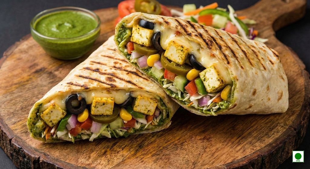 A zesty green chutney base layered with fresh onions, juicy tomatoes, crunchy cucumber, crisp capsicum, shredded cabbage, soft paneer, and cheese, grilled to golden perfection in a warm wrap.