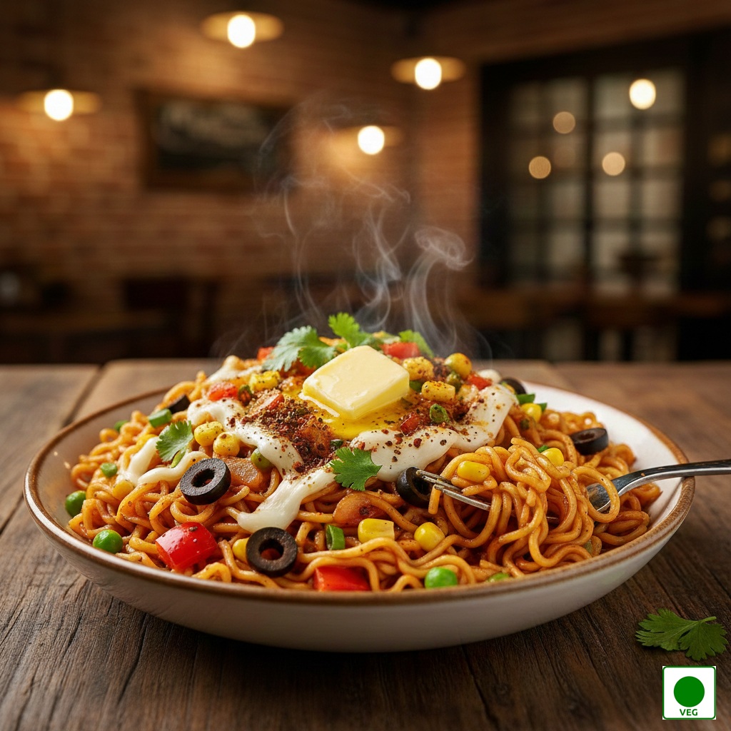 Signature house-special Maggie loaded with vegetables, cheese, butter, and secret spices — rich, spicy, and fully loaded.
