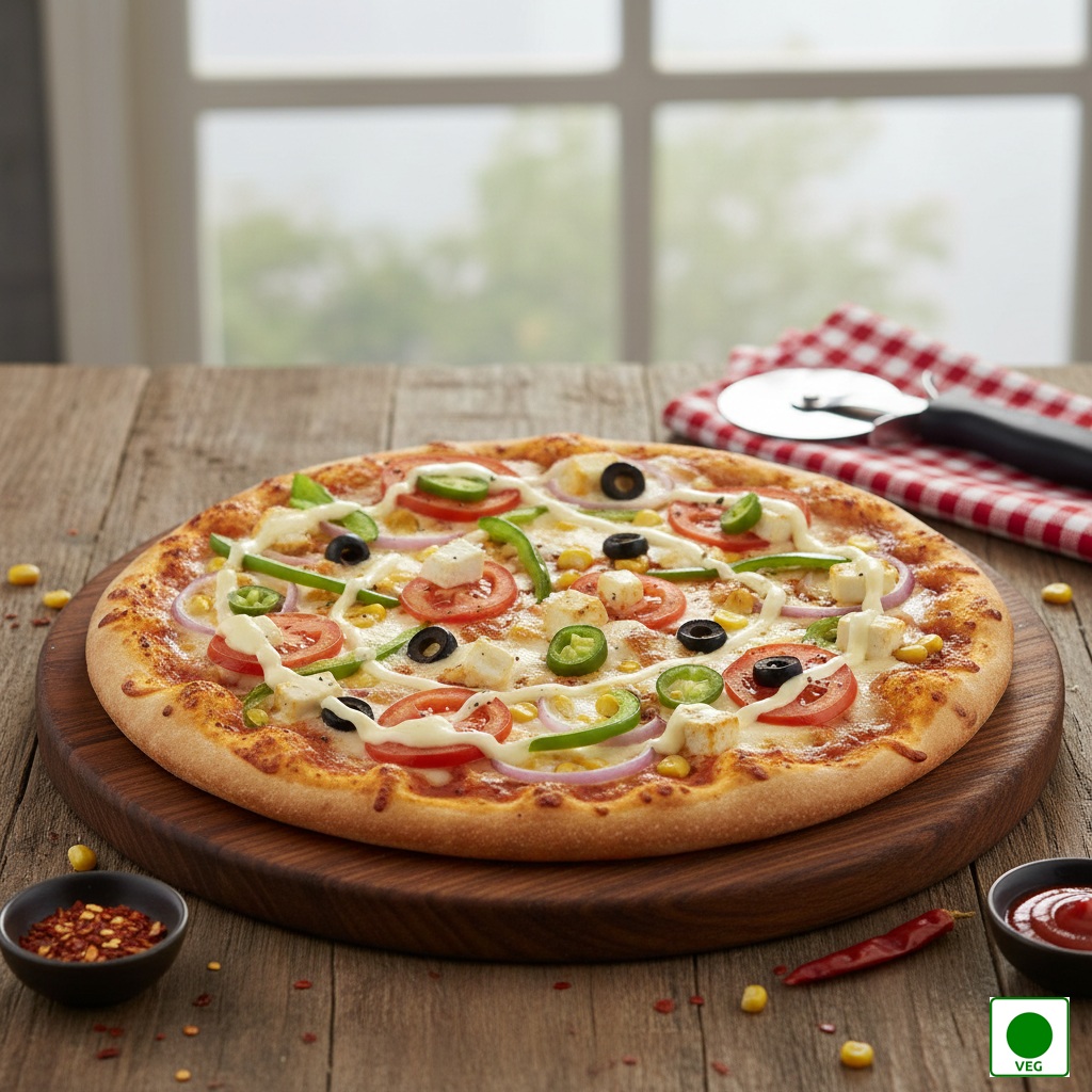 A loaded delight topped with creamy liquid cheese, fresh onions, juicy tomatoes, crisp capsicum, black olives, spicy jalapeños, sweet corn, and soft paneer, layered over rich tomato sauce and baked to golden perfection.