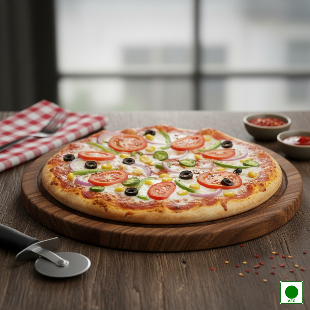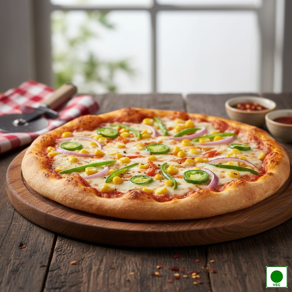 A vibrant blend of sweet corn, spicy jalapeños, crisp capsicum, and fresh onions layered over rich tomato sauce and melted mozzarella on a golden baked crust.