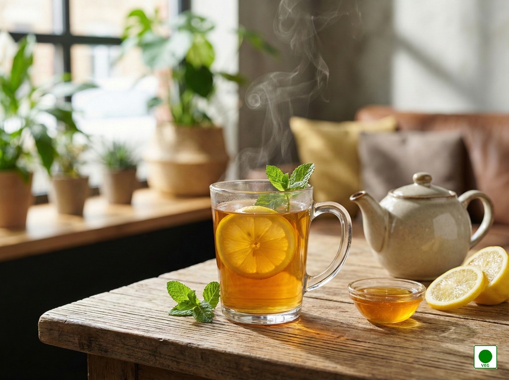 A comforting blend of hot tea, natural honey, and fresh lemon — soothing, sweet, and gently refreshing.