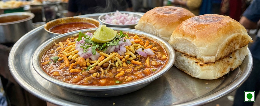 Spicy sprouted curry topped with farsan and onions, served with pav — bold, fiery, and flavorful.