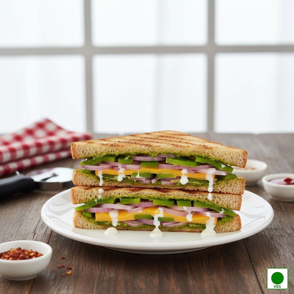 Fresh onions and capsicum layered with cheese, chutneys and sauces in grilled bread — crunchy, fresh, and flavourful.
