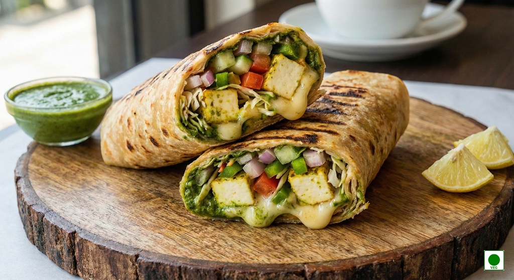 A zesty green chutney base filled with fresh onions, juicy tomatoes, crunchy cucumber, crisp capsicum, shredded cabbage, and soft paneer, grilled to golden perfection in a warm wrap.