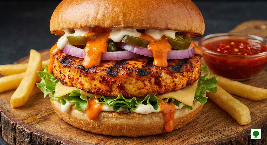 Grilled spicy paneer patty layered with fresh lettuce, onions, creamy sauces, and soft bun — fiery, flavorful, and satisfying.