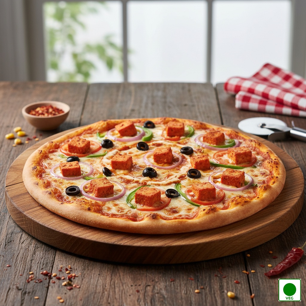 Soft cubes of tandoori-marinated paneer, fresh onions, juicy tomato, crispy capsicum and black olives layered over rich tomato sauce with tandoori sauce and melted mozzarella on a golden baked crust.