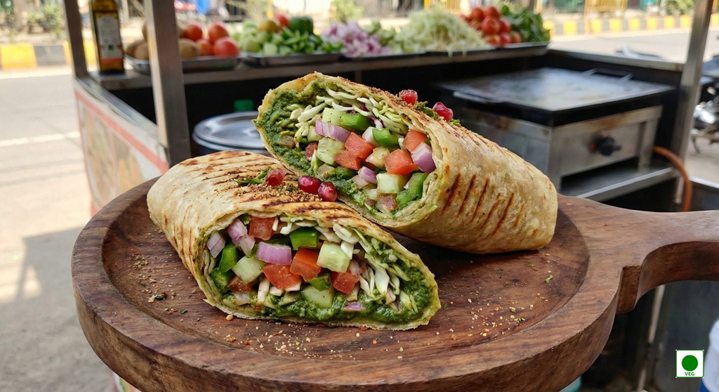 A zesty green chutney base filled with fresh onions, juicy tomatoes, crunchy cucumber, crisp capsicum, and shredded cabbage, wrapped in a warm grilled wrap for a fresh, desi street-food bite.