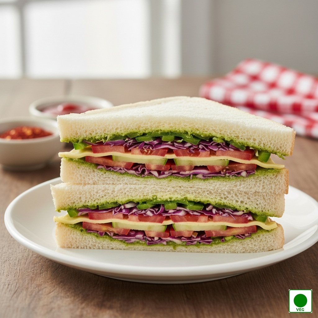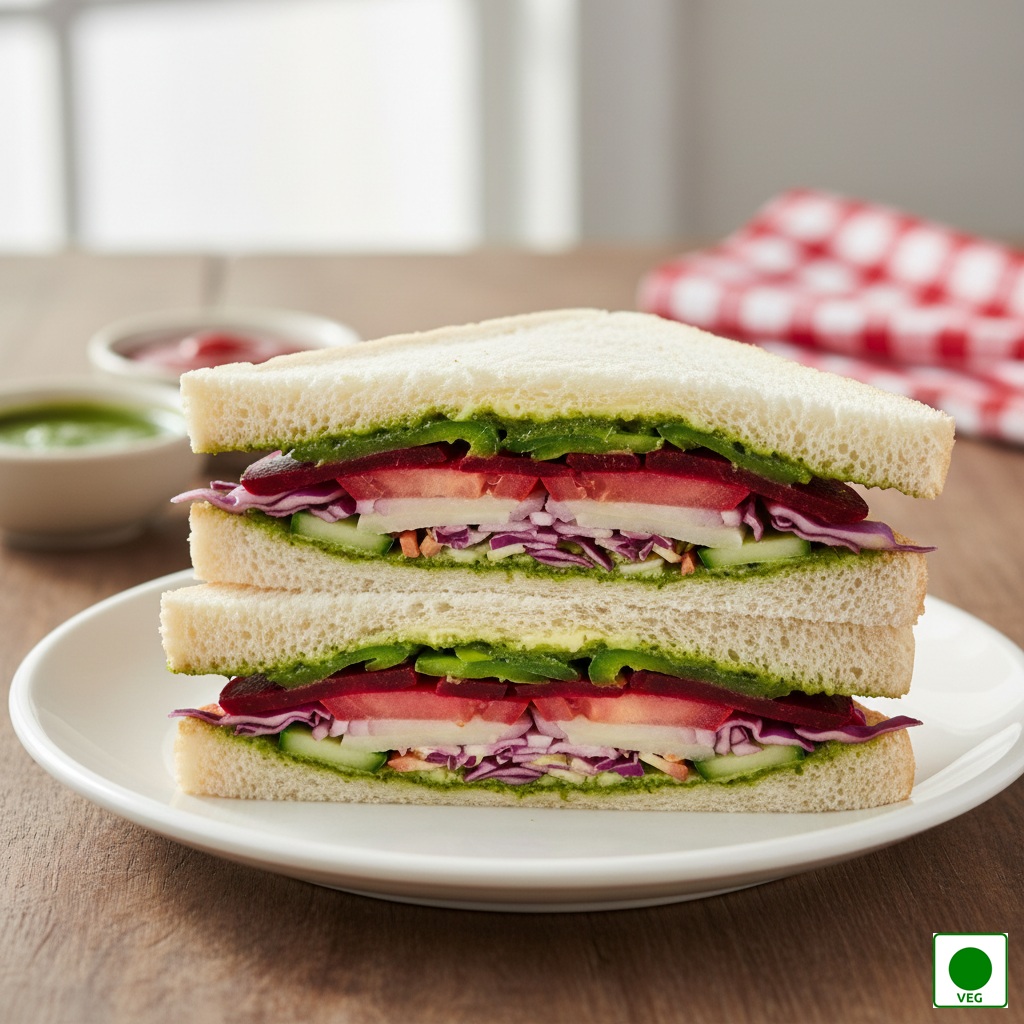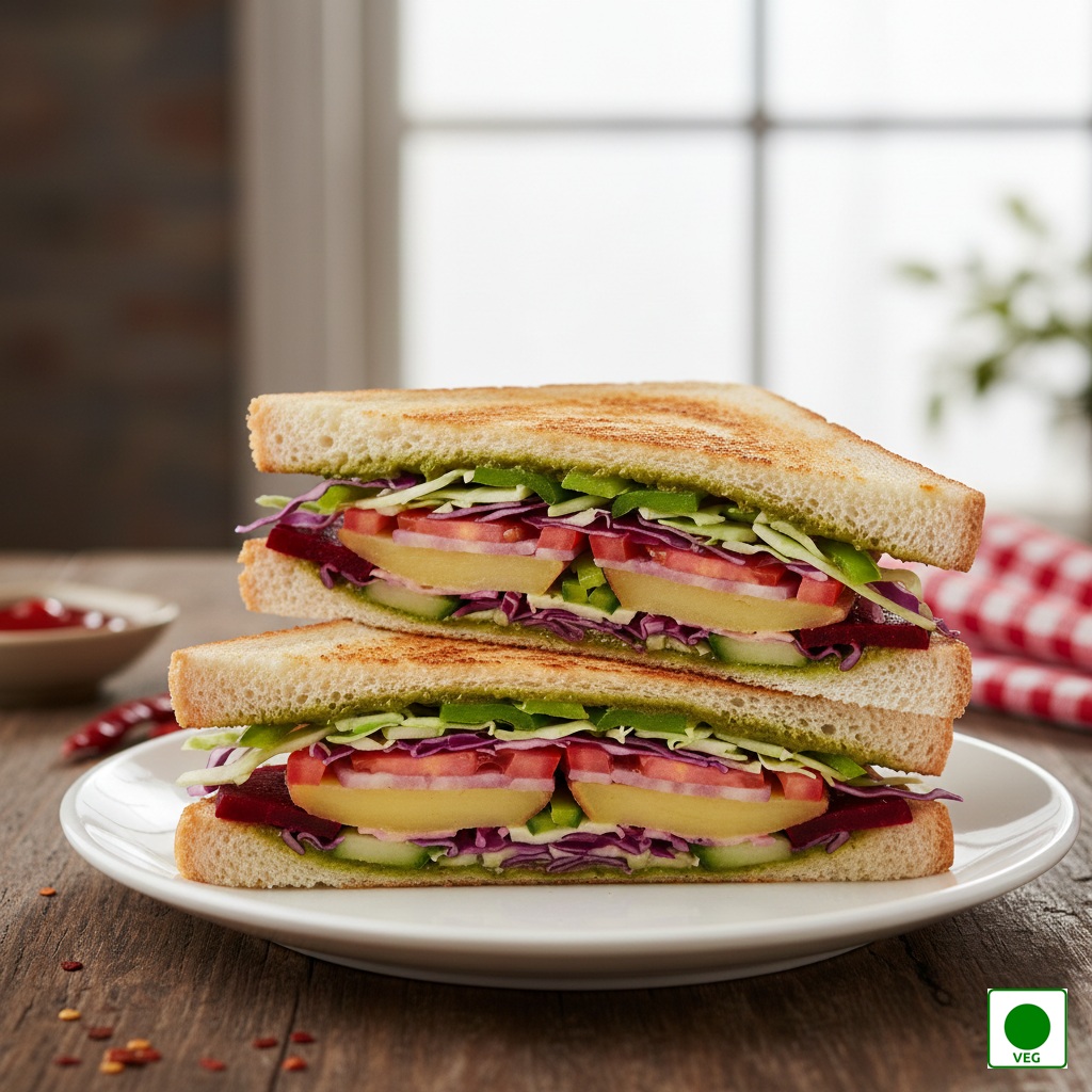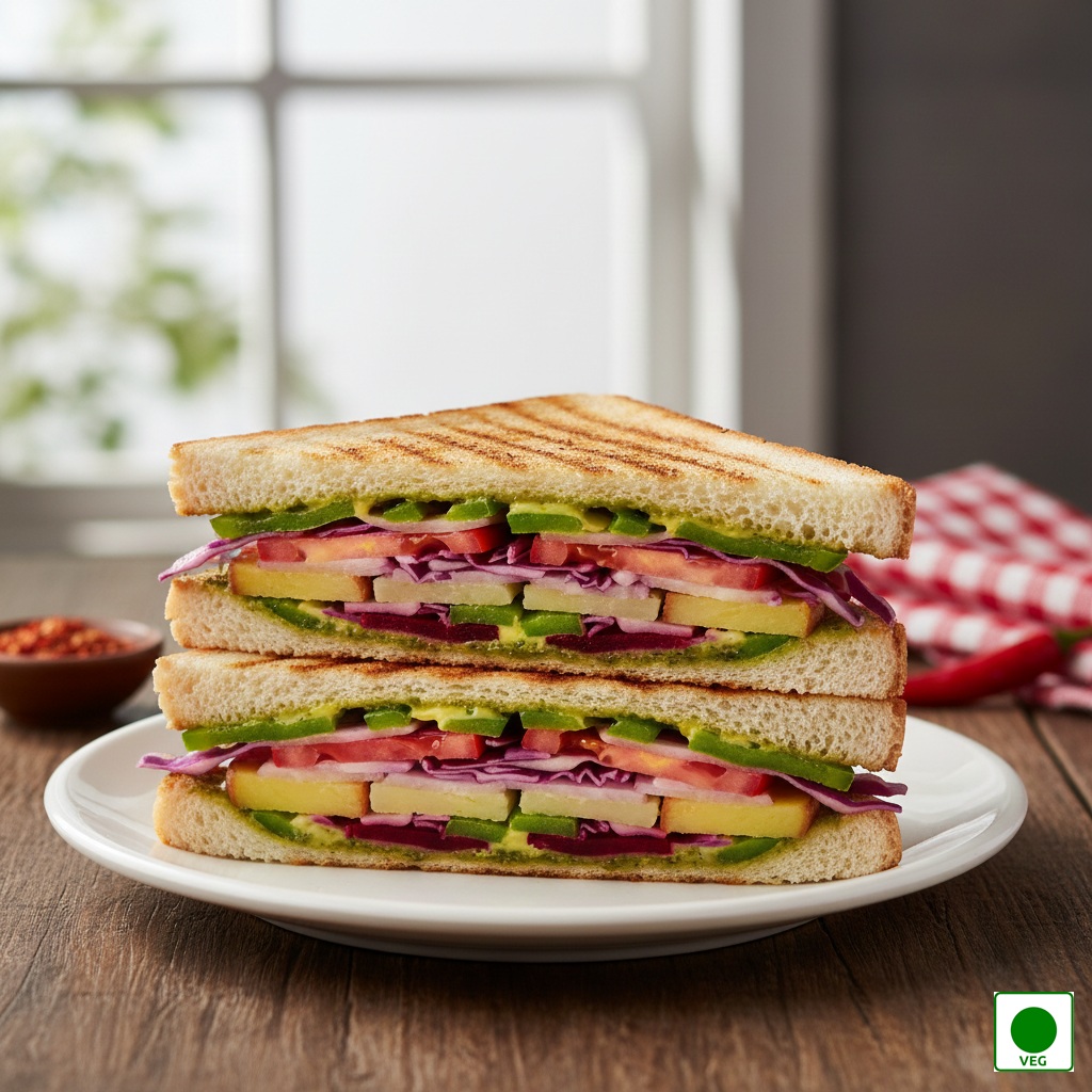 Three layers of bread filled with fresh onions, juicy tomatoes, crisp cucumber, crunchy capsicum, shredded cabbage, soft boiled potato, sweet beetroot, butter, green chutney, and melted cheese, grilled to golden perfection.